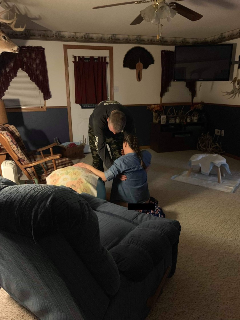 About 6pm my husband returned home and that’s when my contractions started getting quite a bit stronger. I asked midwife (Dawn) to come and help me a bit. I didn’t know what to expect but the contractions were getting stronger. I decided to get in the tub and by the time I got out it was hard for me to stand during contractions and my husband came in to help me and held me. I started to break down a little bit but I knew I had a long ways to go so I had to buck up. Then Dawn arrived.