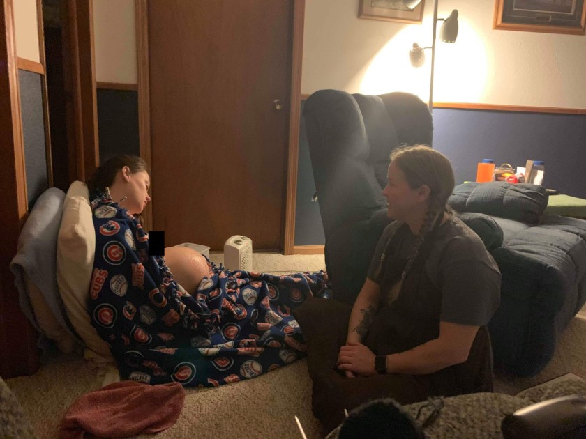 My husband was so glad she was there. He didn’t know what to do. It was alright because neither did I. We were just dealing with it one step at a time. Labor was picking up fast and my other midwife (Melanie) showed up at about midnight. I would cry out and tell them I couldn’t do it and Melanie would tell me “But you are doing it!” God she was pissing me off. Pretty soon I realized I had run completely out of tears. I was on the floor the majority of the time. After a really rough contraction I looked up at my husband and he told me it was hard to watch someone you love in so much pain.