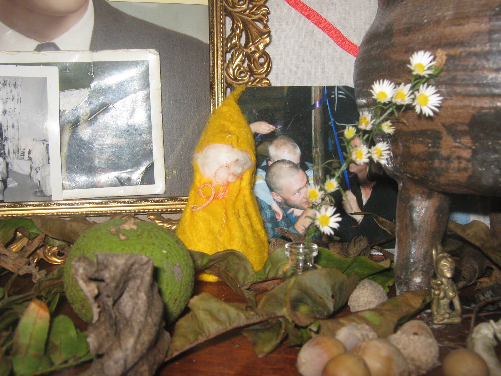 On Saturday we made lanterns, had a special Samhain meal, Shepherds pie with scary cheese shapes, pumpkin pie and pinot noir. We set a place at the table for our anscesters and invited them to join us. After the meal, the food was taken outside and placed at the foot of our ancestor tree. The jack o’lanterns and altar candles were lit.